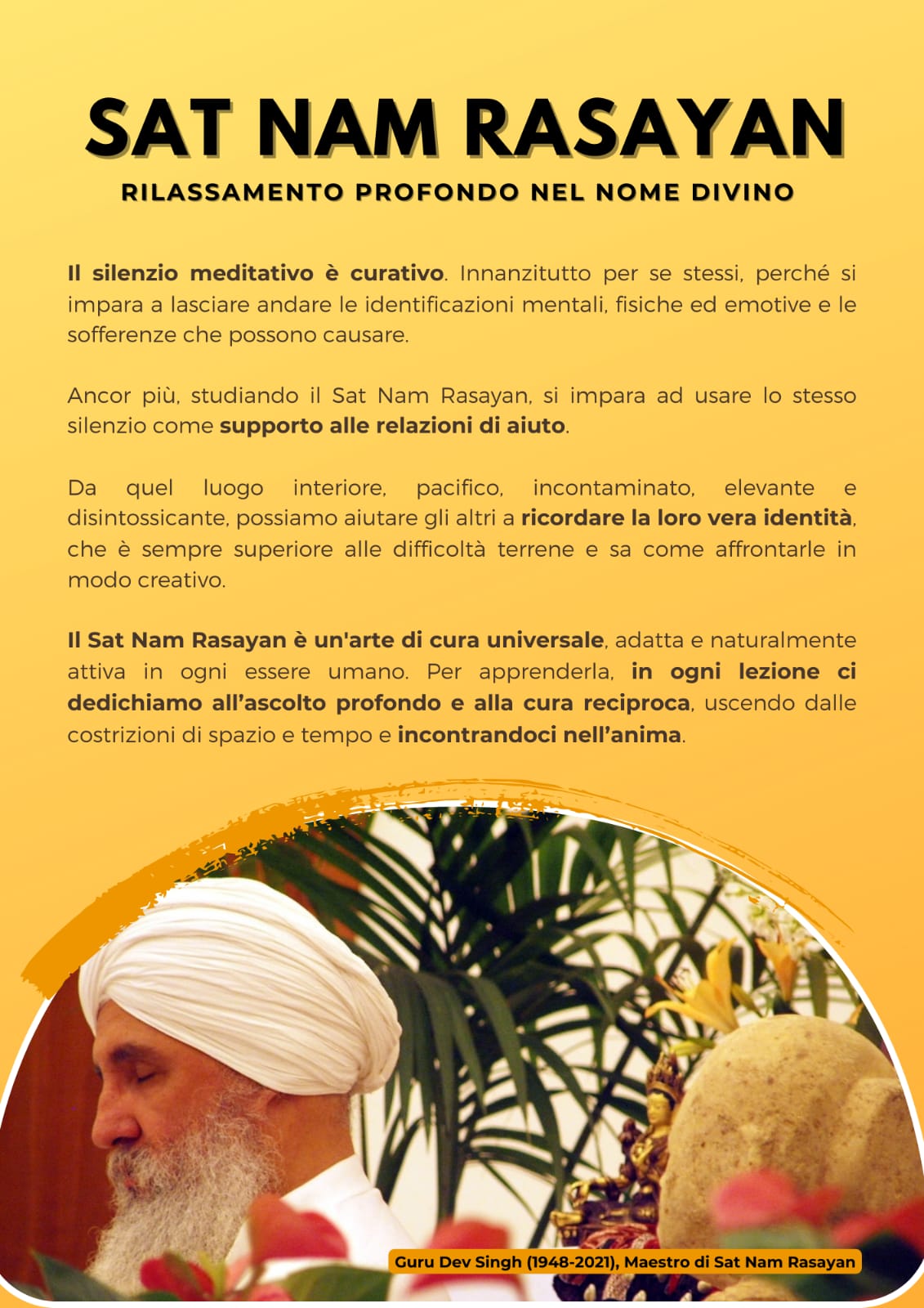 Il seminario Γ¨ propedeutico all’avviamento di un futuro corso per il conseguimento del Diploma di 1 Livello come operatore di Sat Nam Rasayan, ed Γ¨ aperto a tutti coloro che desiderano partecipare.