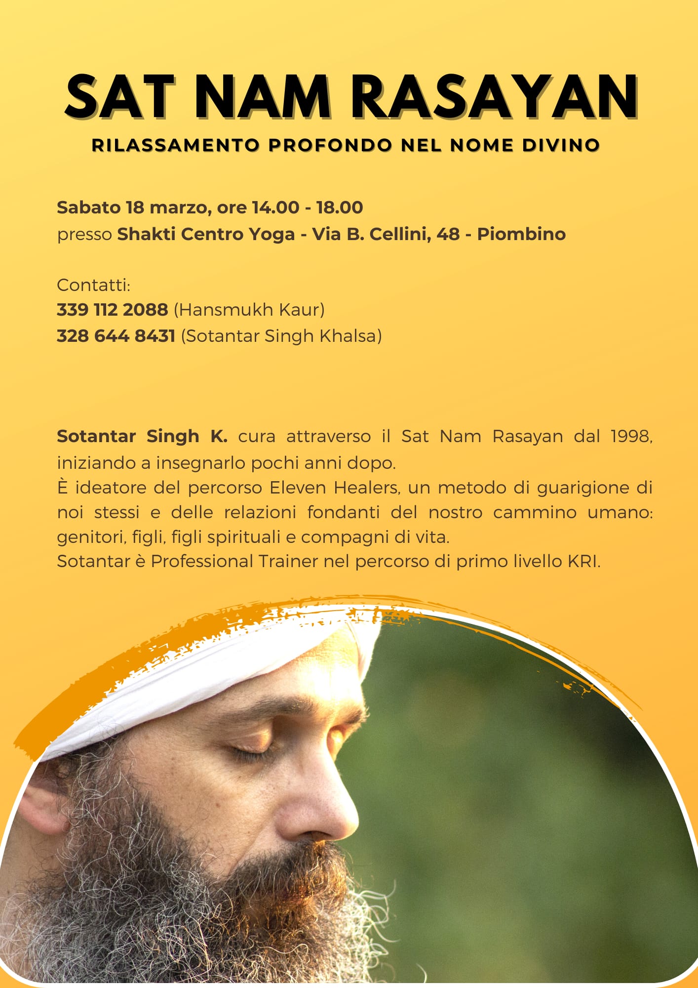 Per la prima volta a Piombino, presso Shakti Centro Yoga, si terrΓ un seminario di Sat Nam Rasayan con Sotantar S. Khalsa .